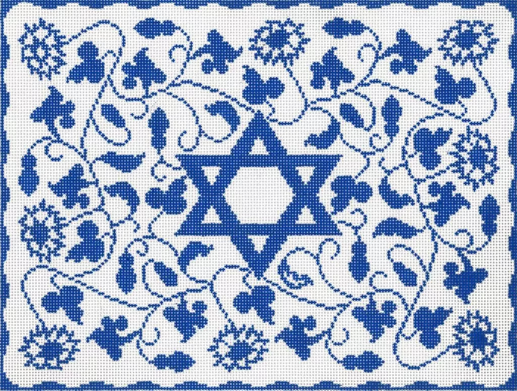 A beautiful hand painted needlepoint canvas from Judaic Designs by Tonya. This hand painted tallis bag needlepoint canvas features an elegant vine motif around a central Star of David in blue and white.