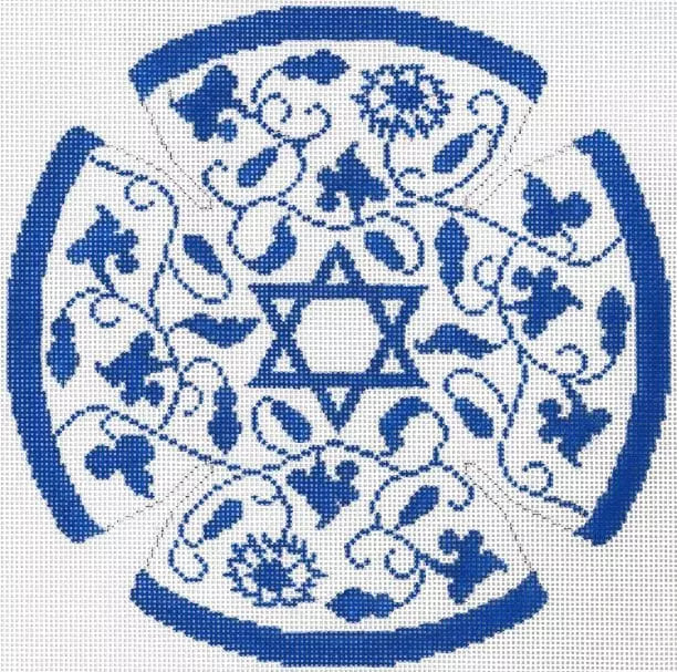 A beautiful hand painted needlepoint canvas from Judaic Designs by Tonya. This hand painted yarmulke or kippah needlepoint canvas features an elegant vine motif around a central Star of David in blue and white.