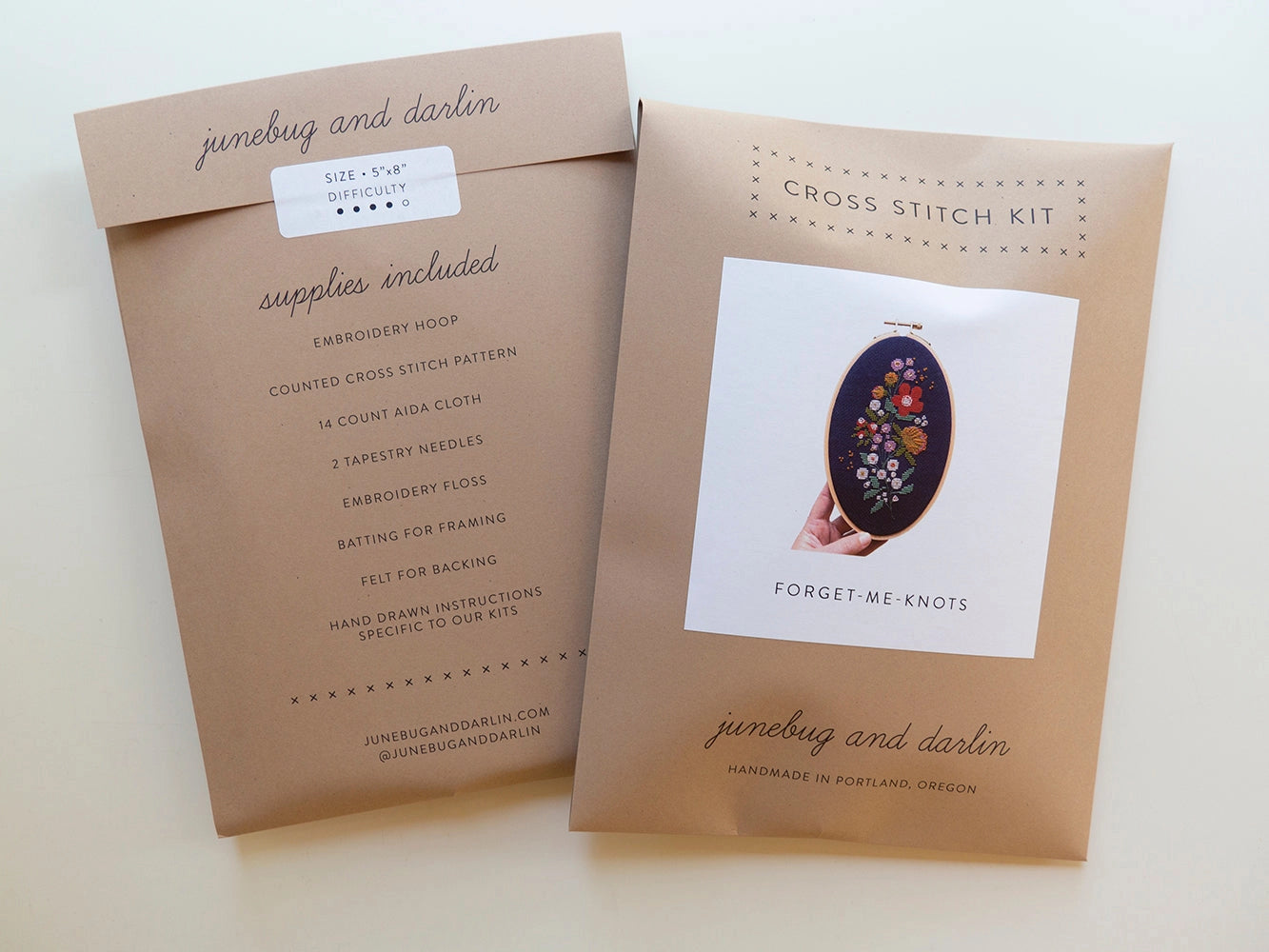 Junebug and Darlin's Forget-Me-Knots Kit is perfect for advanced stitchers! It showcases a floral bouquet of bright colored threads on navy cloth. It also comes with an oval hoop to make finishing your project a breeze. Our kit provides you with the tools necessary to perfect various stitches.