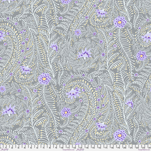 This cotton fabric by Kaffe Fassett features a delicate fern pattern in white against a grey background with yellow and purple details.