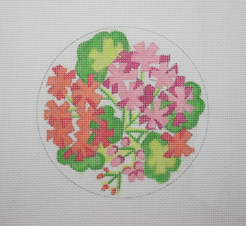 Kate Dickerson Needlepoint Collections Insert - Pink & Salmon Geraniums Needlepoint Canvas - 4 Round
