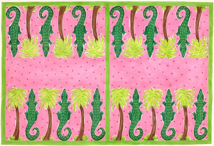 Kate Dickerson Needlepoint Collections Backgammon Board Canvas - Lilly-Inspired Gators & Palms - Bright Pinks & Greens Needlepoint Canvas