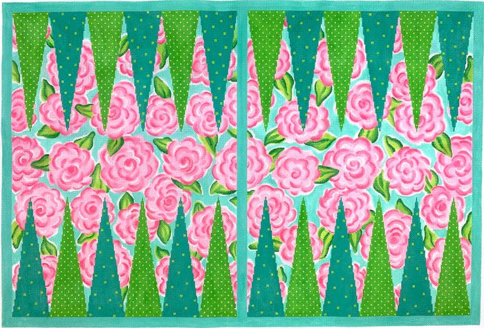 Kate Dickerson Needlepoint Collections Backgammon Board Canvas - Lilly-Inspired Roses - Pinks, Greens & Turquoise Needlepoint Canvas