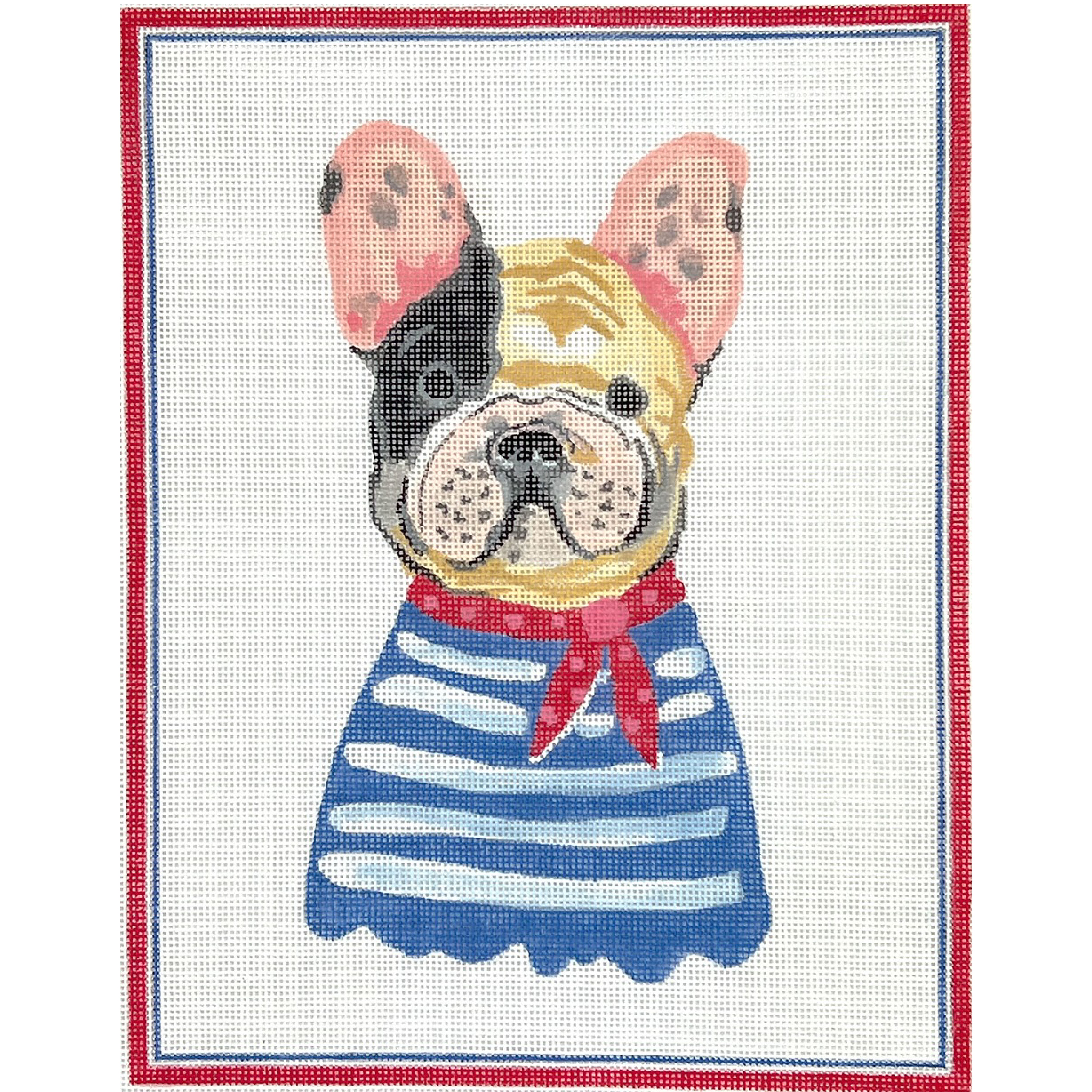 A beautiful hand painted needlepoint design by Carolyn Gavin for Kate Dickerson Needlepoint Collections. It features a handsome French bulldog in a striped shirt with a neck scarf.