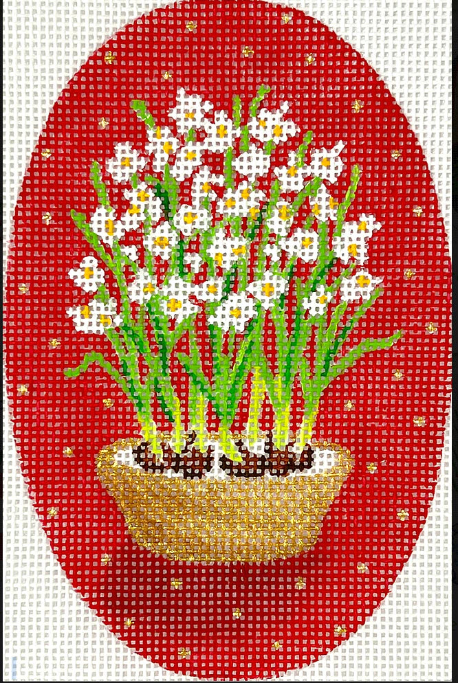 Kate Dickerson Needlepoint Collections Christmas Ornament - Paperwhites In Gold Bowl on Red with Gold Dots Needlepoint Canvas