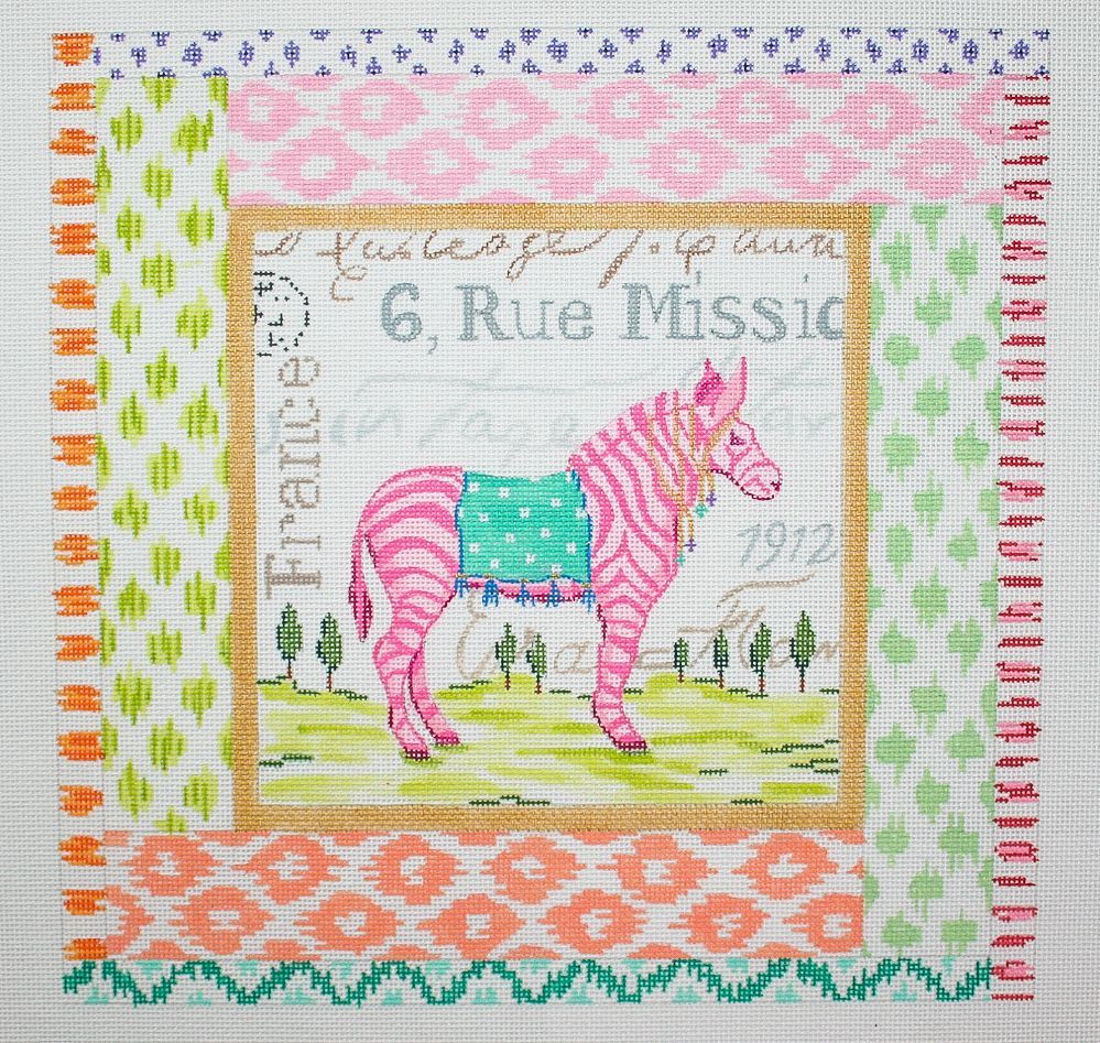Kate Dickerson Needlepoint Collections Exotic Collage - Pink Zebra with Mixed Ikat Border Needlepoint Canvas