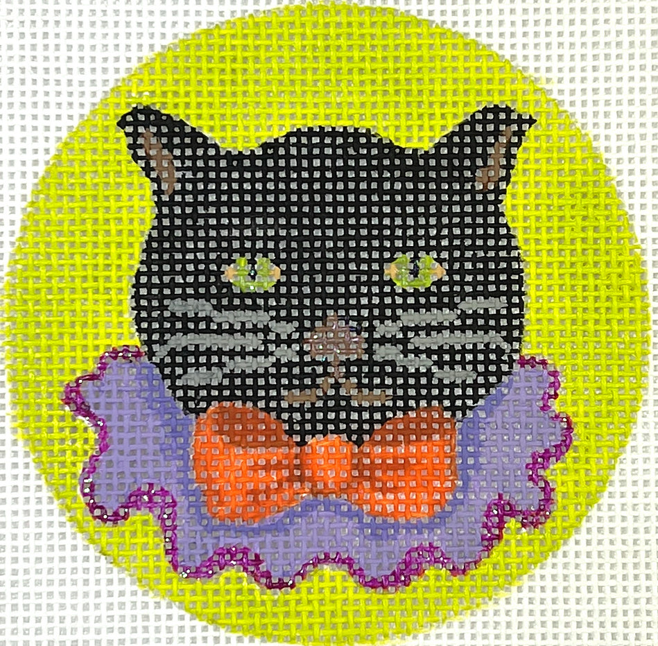 Kate Dickerson Needlepoint Collections Halloween Mini - Black Cat with Orange Bow Tie & Purple Ruff on Acid Green Background Needlepoint Canvas