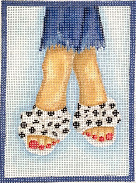Kate Dickerson Needlepoint Collections Here's Looking at Shoe - Polka Dot Open-Toe Slides with Bows - White with Black Needlepoint Canvas