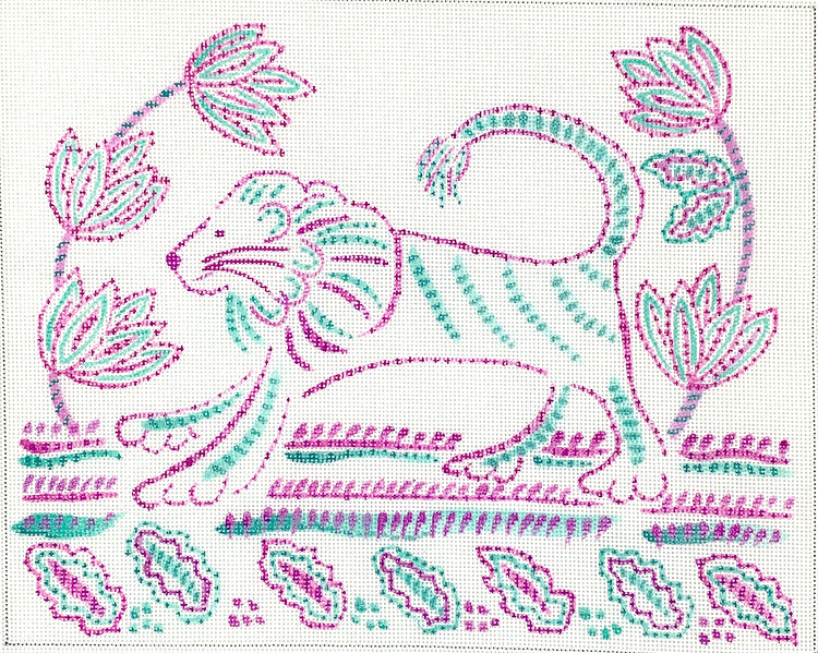 Kate Dickerson Needlepoint Collections Jilly Walsh Indian Textile Inspired Tiger in Purple & Teal Needlepoint Canvas