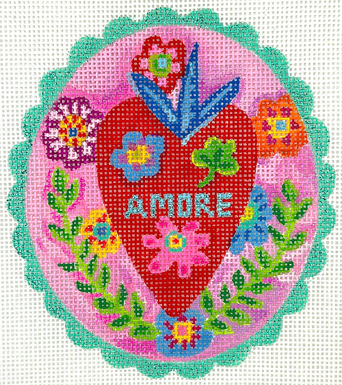 Kate Dickerson Needlepoint Collections Julia Eves - Amore Red Heart with Flowers & Leaves on Pink with Sparkly Turquoise Border Needlepoint Canvas
