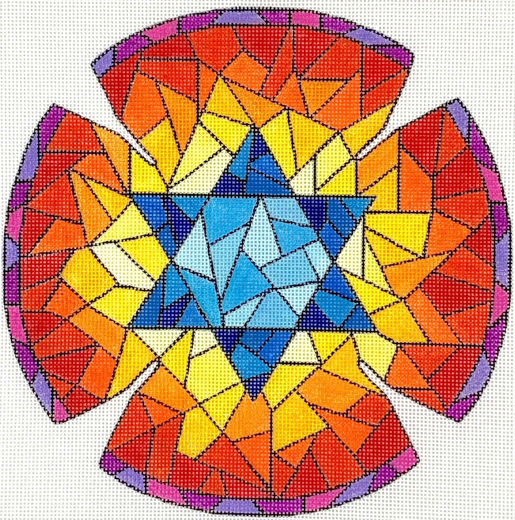 Kate Dickerson Needlepoint Collections Kippah - Stained Glass with Star of David - Blues, Yellows, Reds, Oranges & Purples with Black Needlepoint Canvas