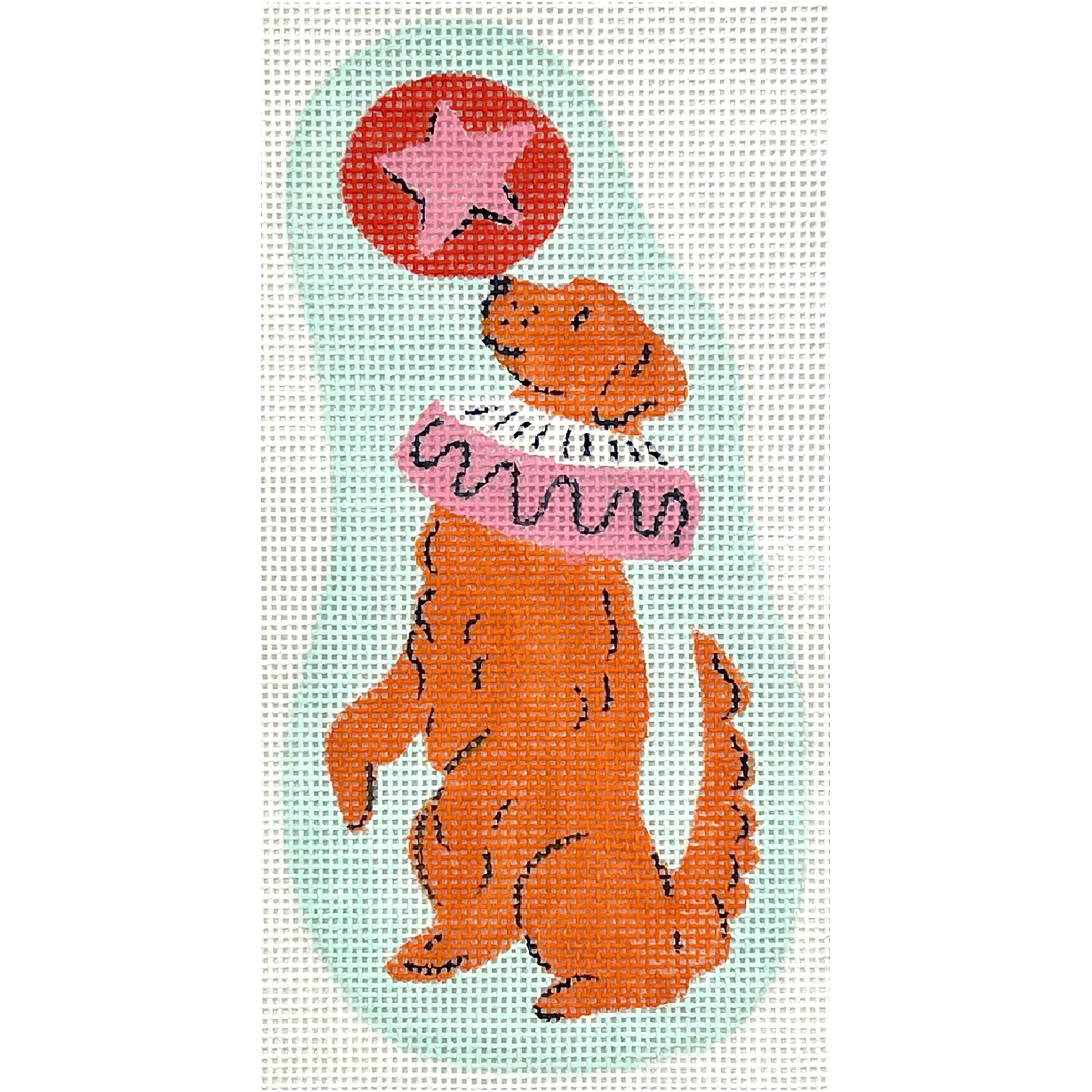 A beautiful hand painted needlepoint design by Krissy Masty for Kate Dickerson Needlepoint Collections. It features a cute dog balancing a circus ball.