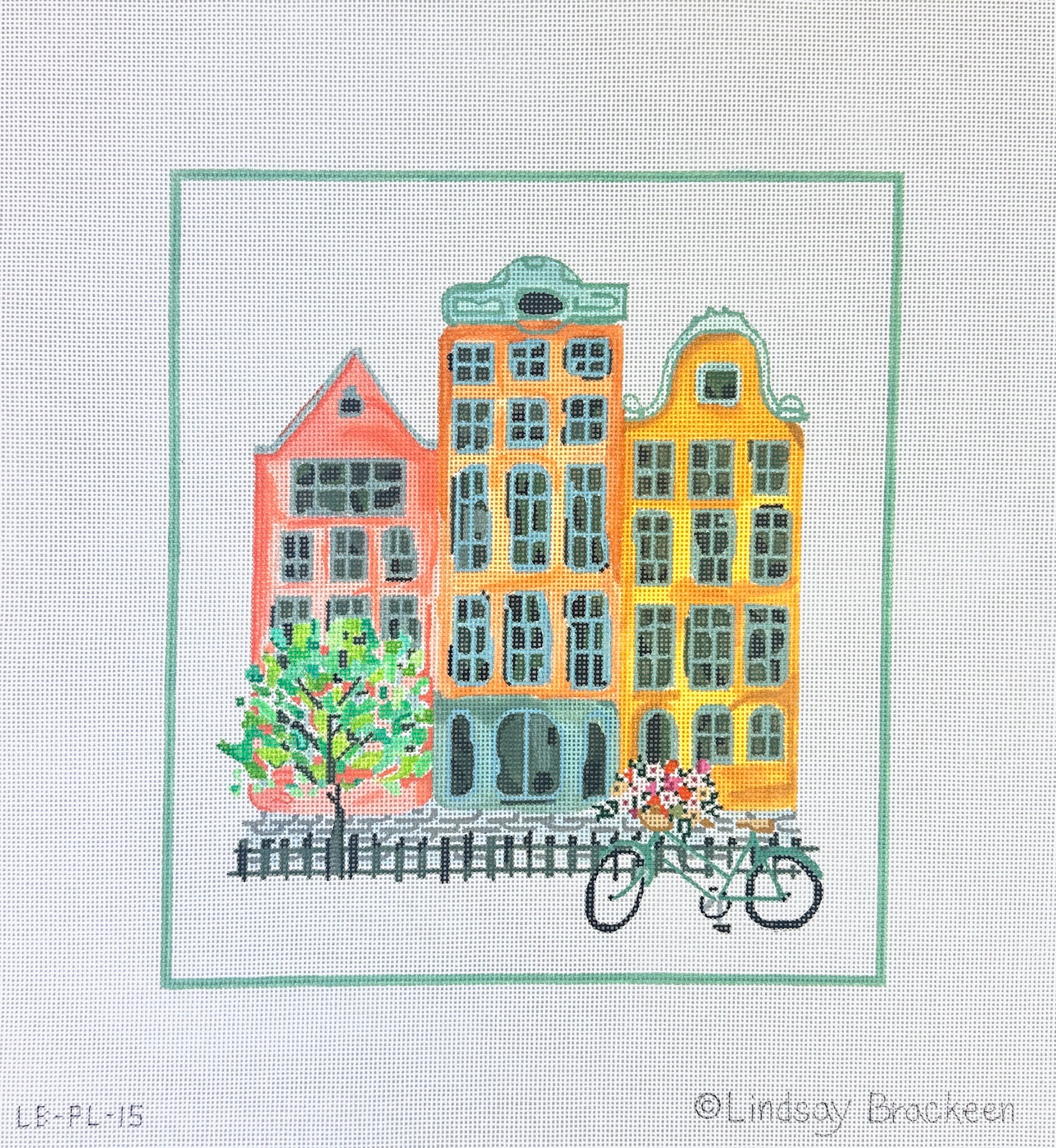 This hand painted needlepoint canvas by Lindsay Brackeen from Kate Dickerson Needlepoint Collections features a series of houses with a bicycle outside.