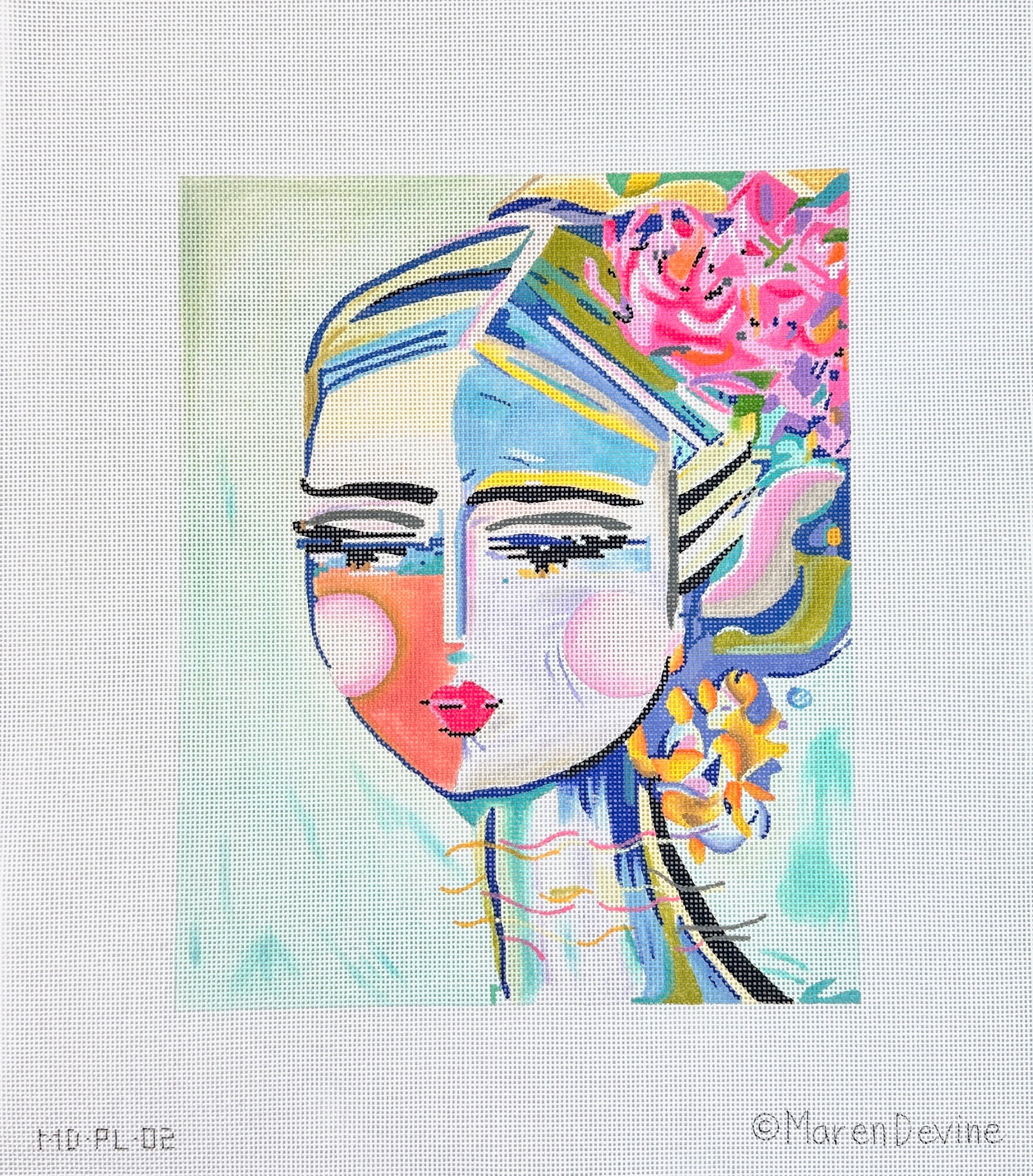 This is a hand painted needlepoint canvas from Kate Dickerson Needlepoint Collections. It features a colorful and abstract design of the side profile of a woman.