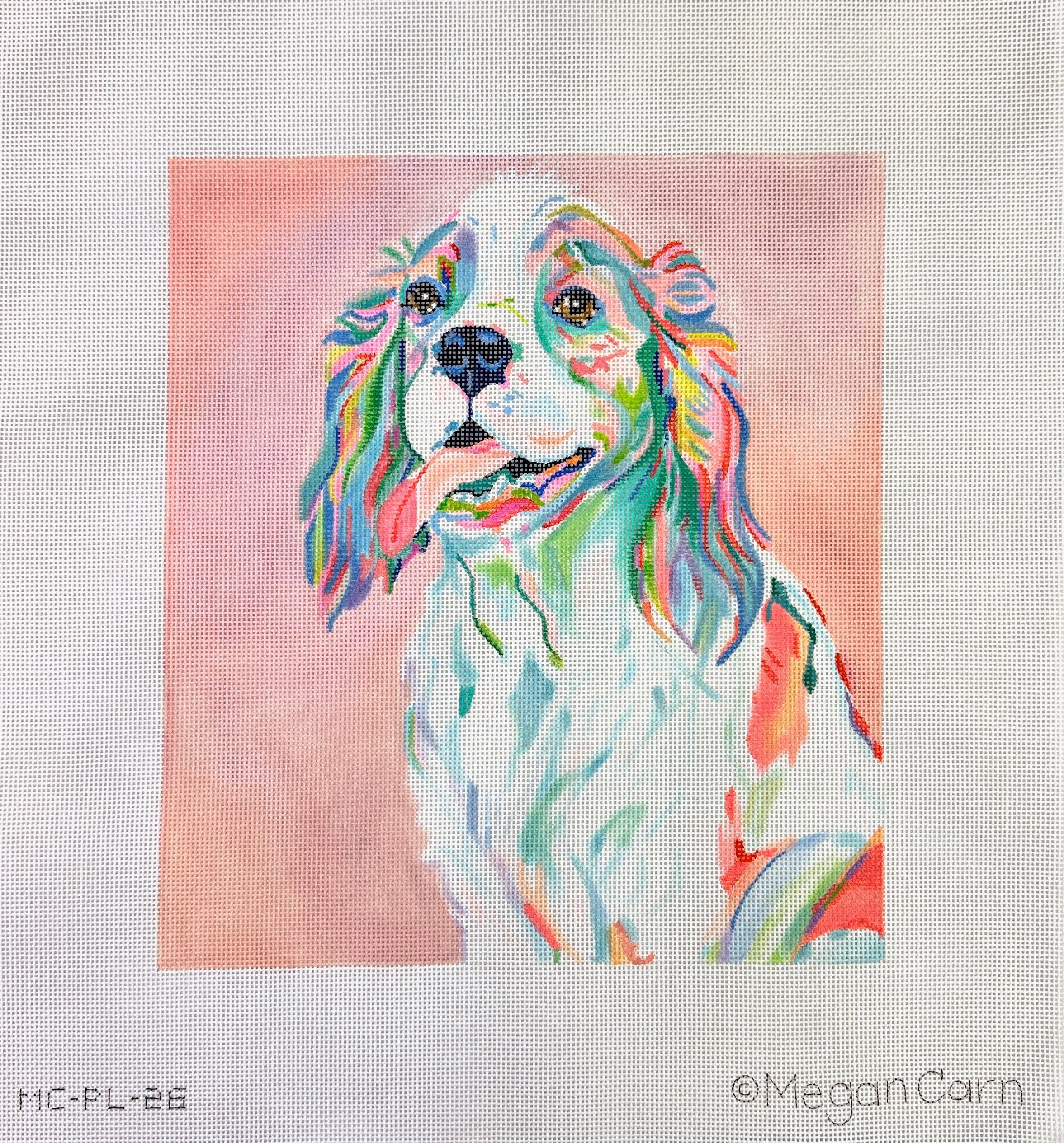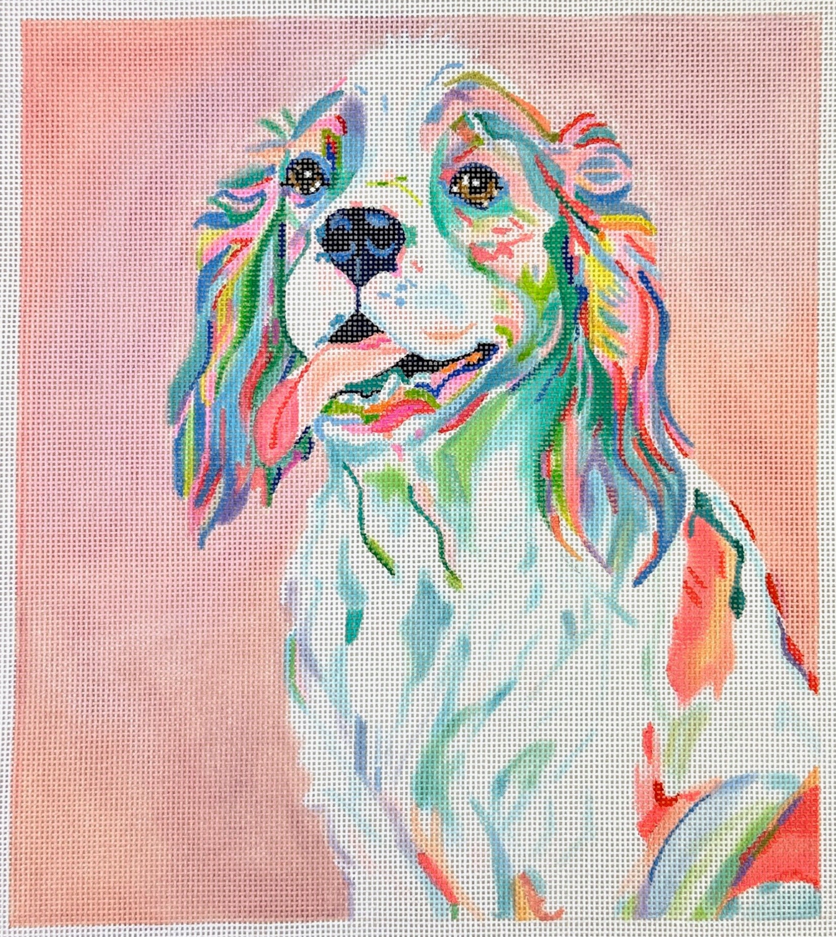 This hand painted needlepoint canvas by Megan Carn from Kate Dickerson Needlepoint Collections features a cute King Charles Cavalier with a vibrant peach color scheme.