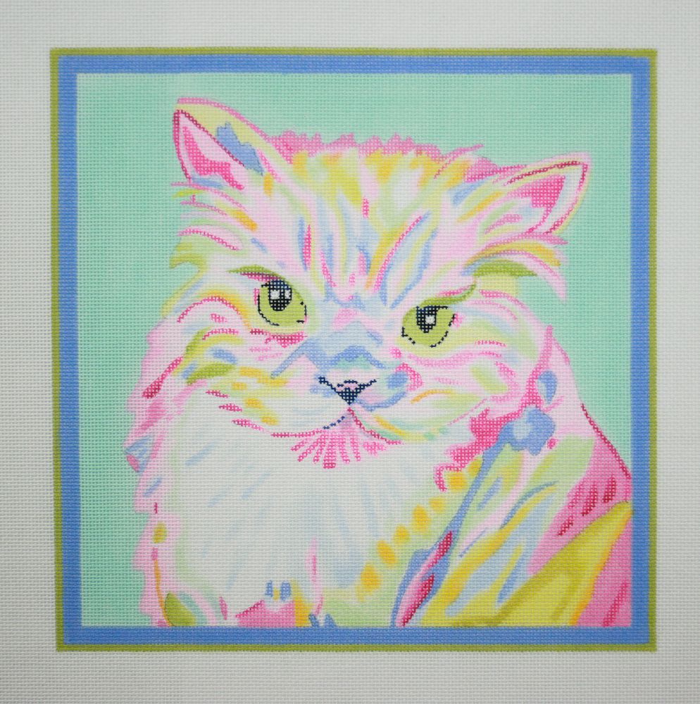 Kate Dickerson Needlepoint Collections Megan Carn - Persian Cat - Bright Pastels on Light Aqua Needlepoint Canvas