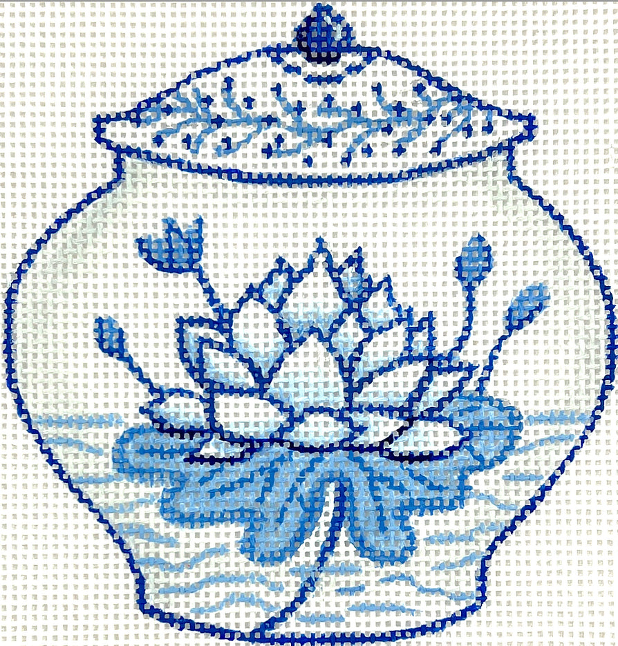 Kate Dickerson Needlepoint Collections Mini Chinese Vase - Short Blue & White with Lotus Flower Needlepoint Canvas