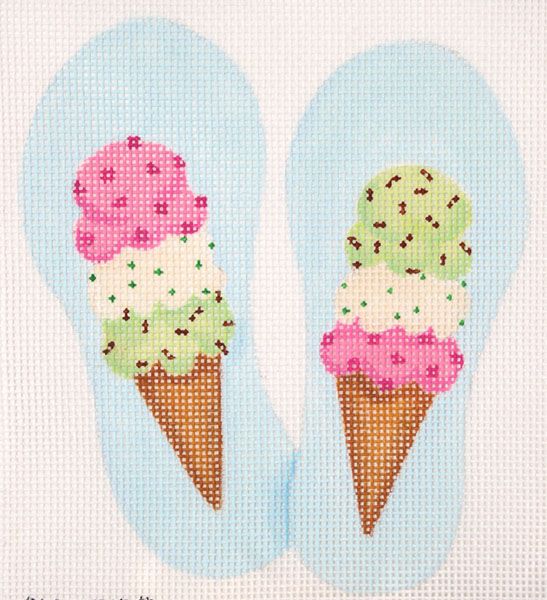Kate Dickerson Needlepoint Collections Mini Flip Flop - Ice Cream Cones - Pinks, Greens & Tans on Sky Needlepoint Canvas