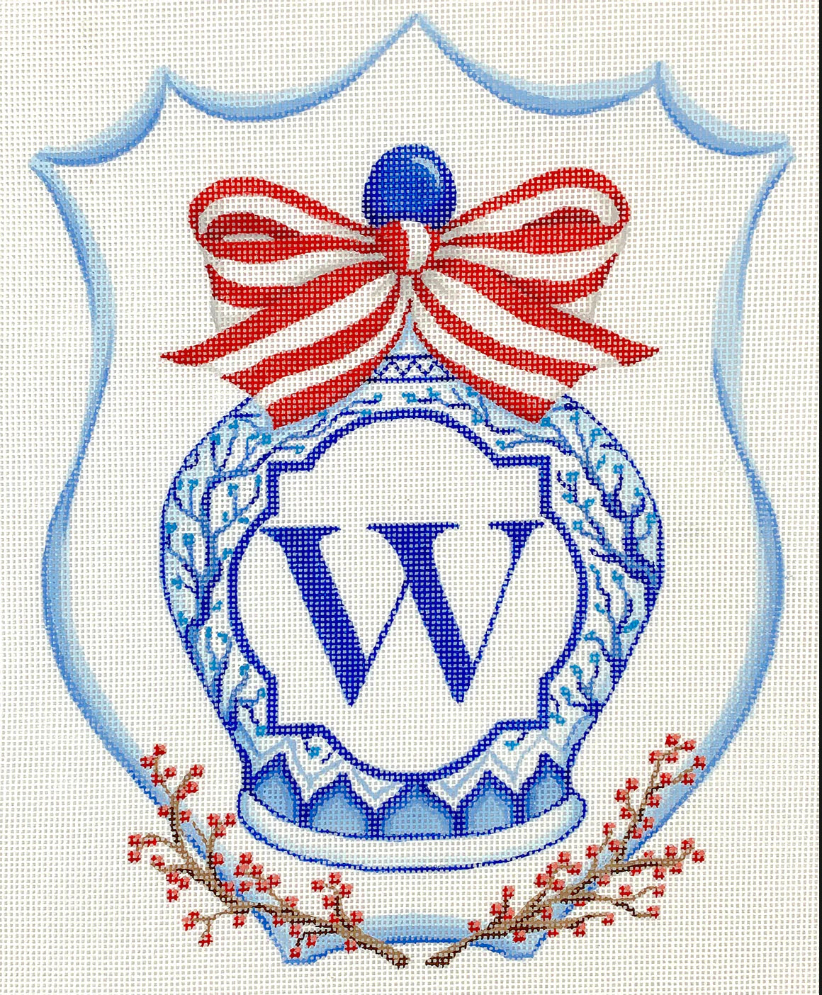 Kate Dickerson Needlepoint Collections Monogram Crest - Chinese Vase with Bow - Blues & Reds Needlepoint Canvas