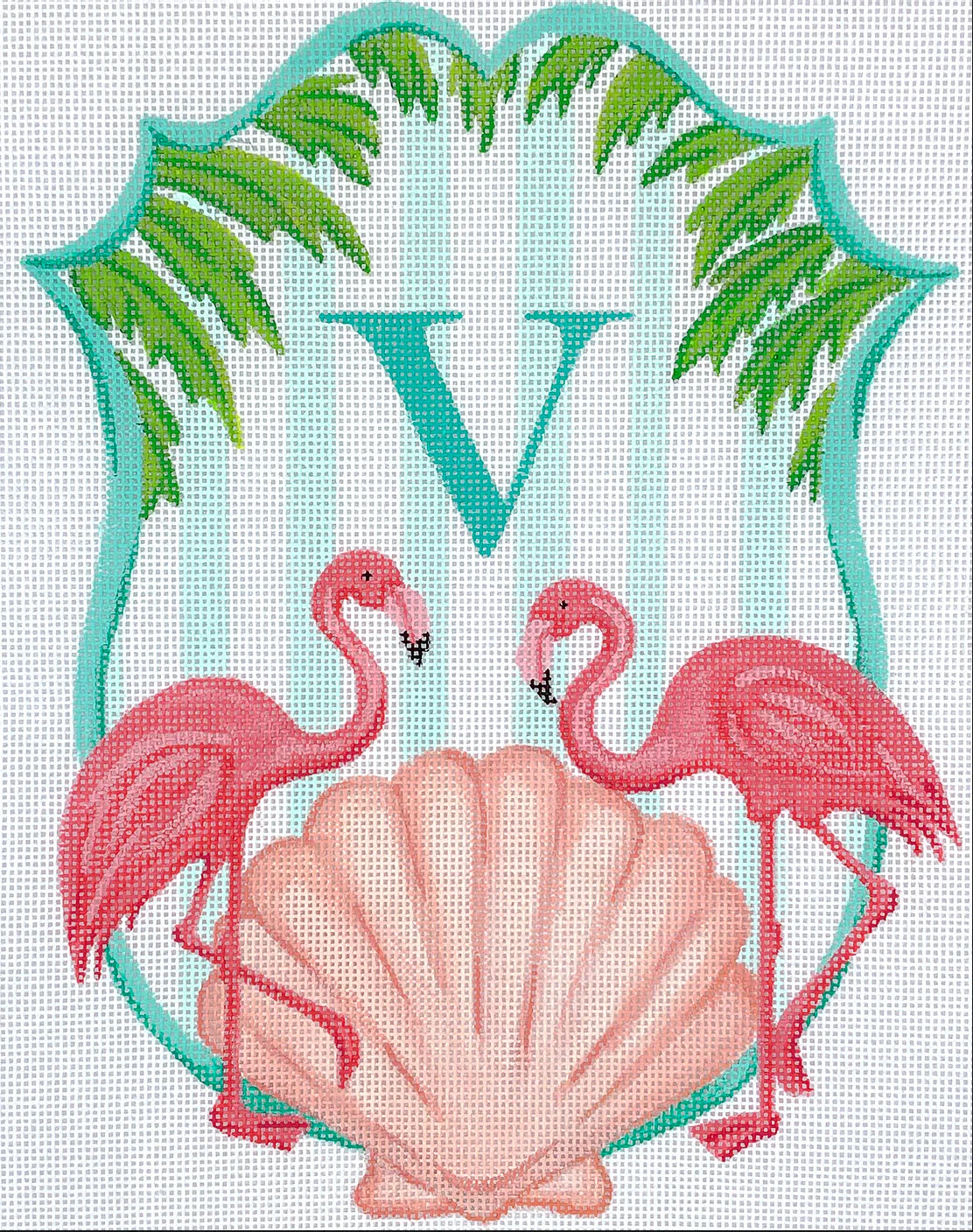 Kate Dickerson Needlepoint Collections Monogram Crest - Flamingos, Scallop & Palm Branches with Aqua Stripes Needlepoint Canvas