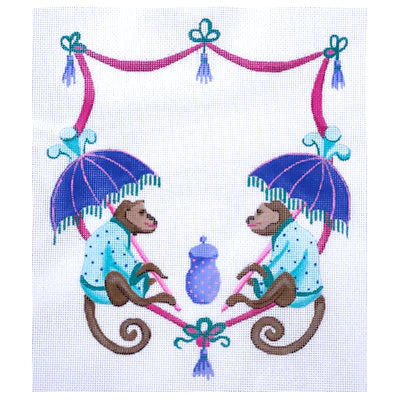 Kate Dickerson Needlepoint Collections Monogram Crest - Monkeys with Parasols - Pinks, Purples & Turquoise Needlepoint Canvas