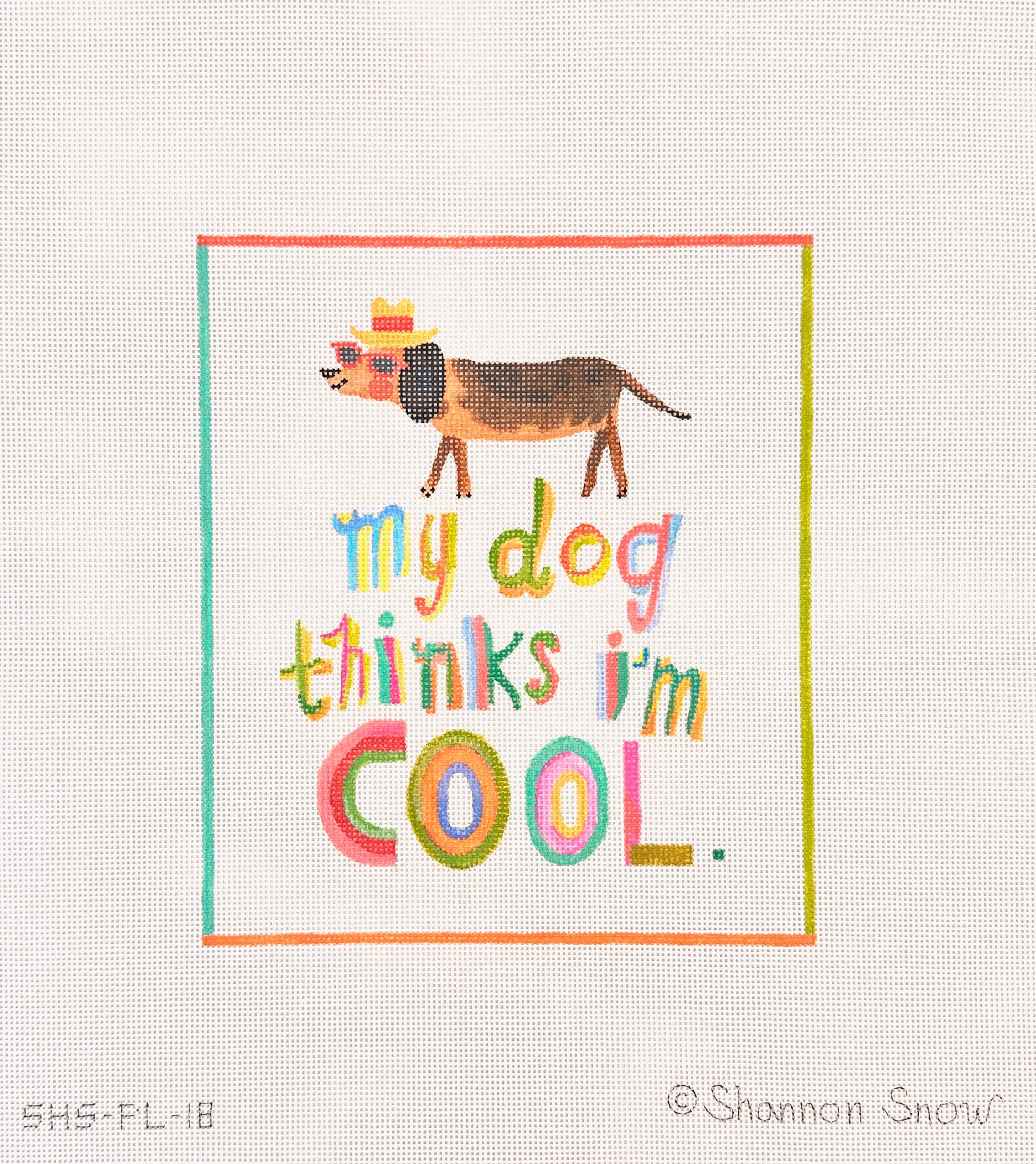 This is a needlepoint canvas by Shannon Snow from Kate Dickerson Needlepoint Collections. It features an adorable dachshund wearing sunglasses and a hat, posed above text stating "my dog thinks I'm cool".