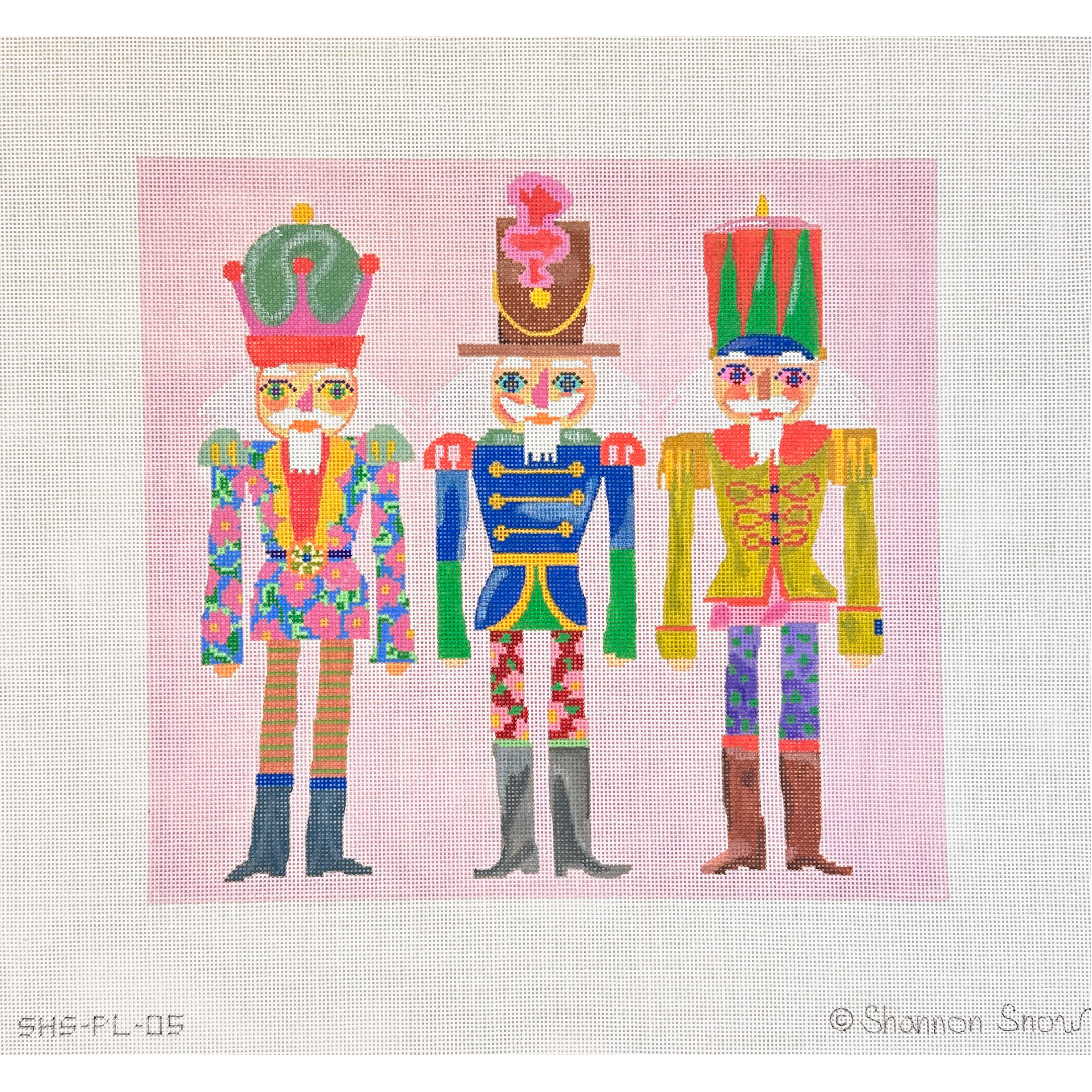 A beautiful hand painted needlepoint design from Kate Dickerson Needlepoint Collections featuring three colorful nutcrackers by Shannon Snow.