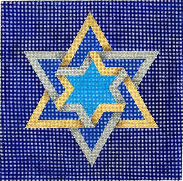 Kate Dickerson Needlepoint Collections Tefillin Bag Double Interlocking Star of David Golds & Silvers on Deep Blue Needlepoint Canvas