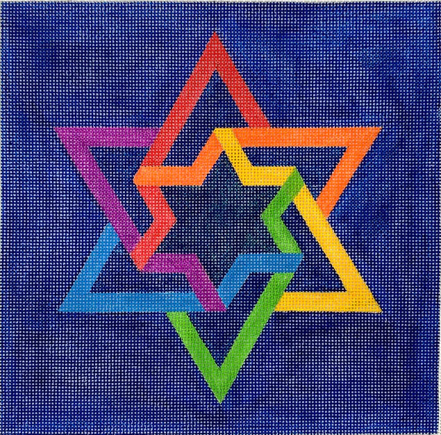 Kate Dickerson Needlepoint Collections Tefillin Bag - Double Interlocking Star of David - Rainbow Colors on Deep Blue Needlepoint Canvas