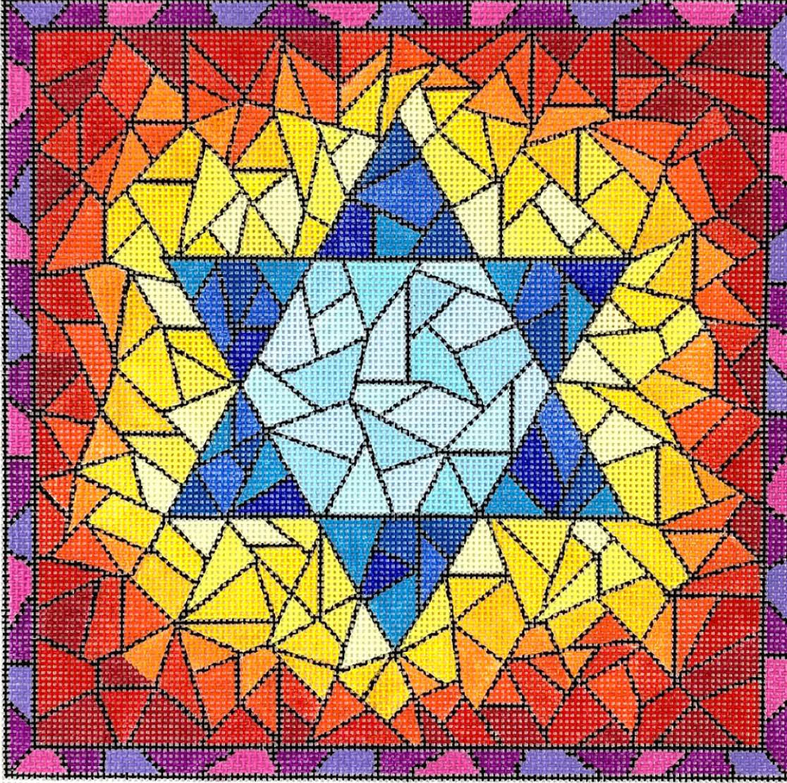 Kate Dickerson Needlepoint Collections Tefillin Bag - Stained Glass with Star of David - Blues, Yellows, Oranges, Reds & Purples with Black Needlepoint Canvas