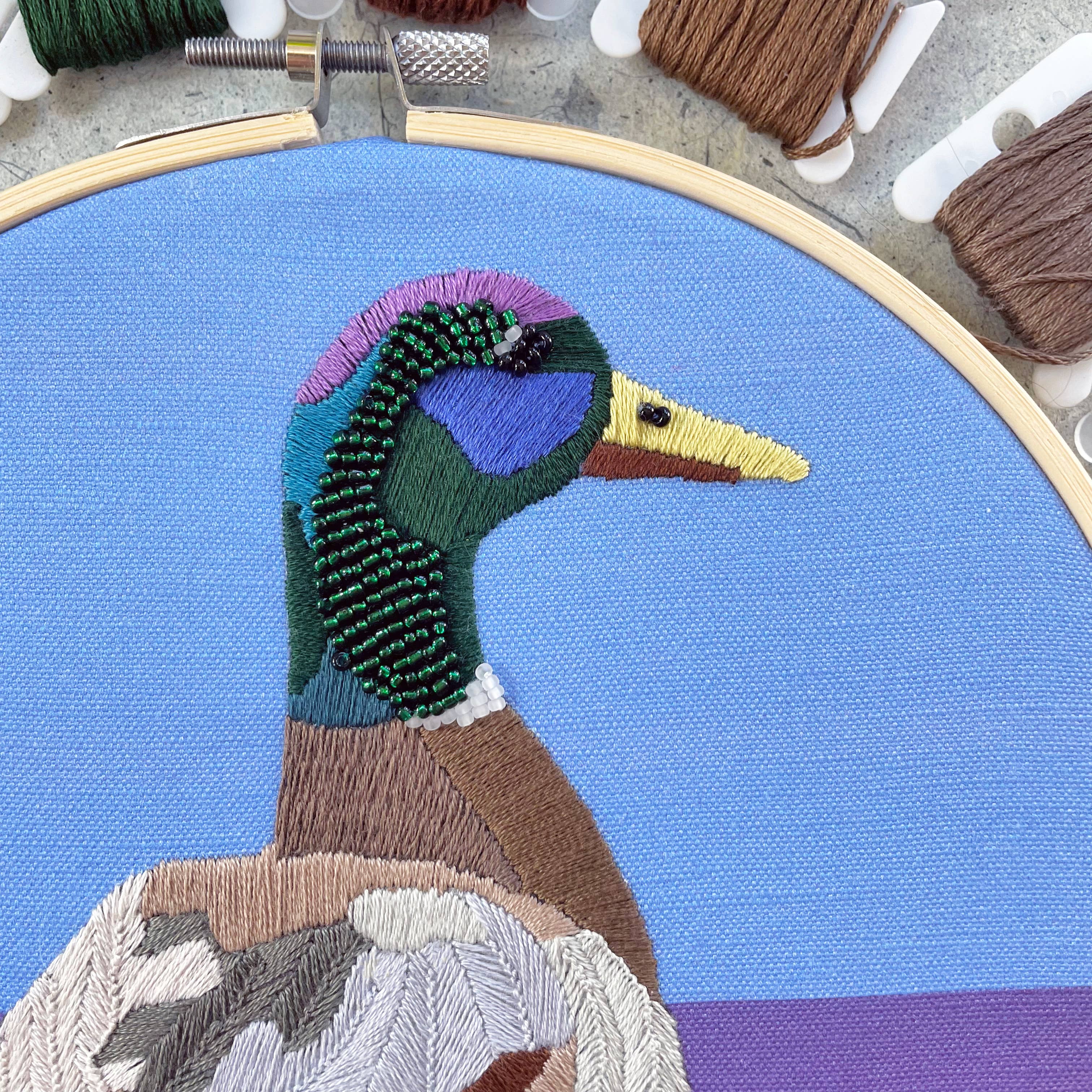 This kit by Kate Wyatt Fine Art incorporates embroidery and beadwork to create a stunning representation of the classic mallard duck. Beadwork is along the neck, eye, nose, tail, and feet. This pattern also features a modified feather stitch to achieve realistic texture. The kit includes everything you need to get started. Embroidering is a fun and relaxing way to keep your brain busy and cut down on screen time. While there is no “right” way to embroider, this kit provides written instructions for determined beginners and beyond to create a beautiful piece of artwork.