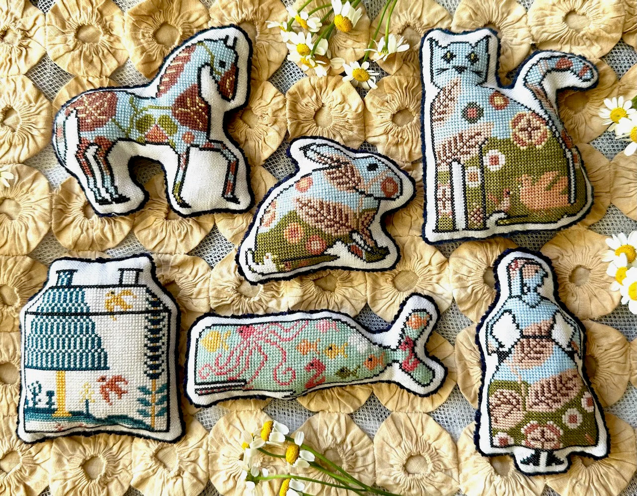 This is a printed cross stitch pattern by Kathy Barrick. It features the second in the Cookie Cutters series, which involves several solid individual "cookie cutter" cut outs from the designer's other larger designs. As stitched, the example uses Needlepoint Inc Silk on 40 count linen in the color Boardwalk from Colour & Cotton. A DMC color conversion chart is also available.