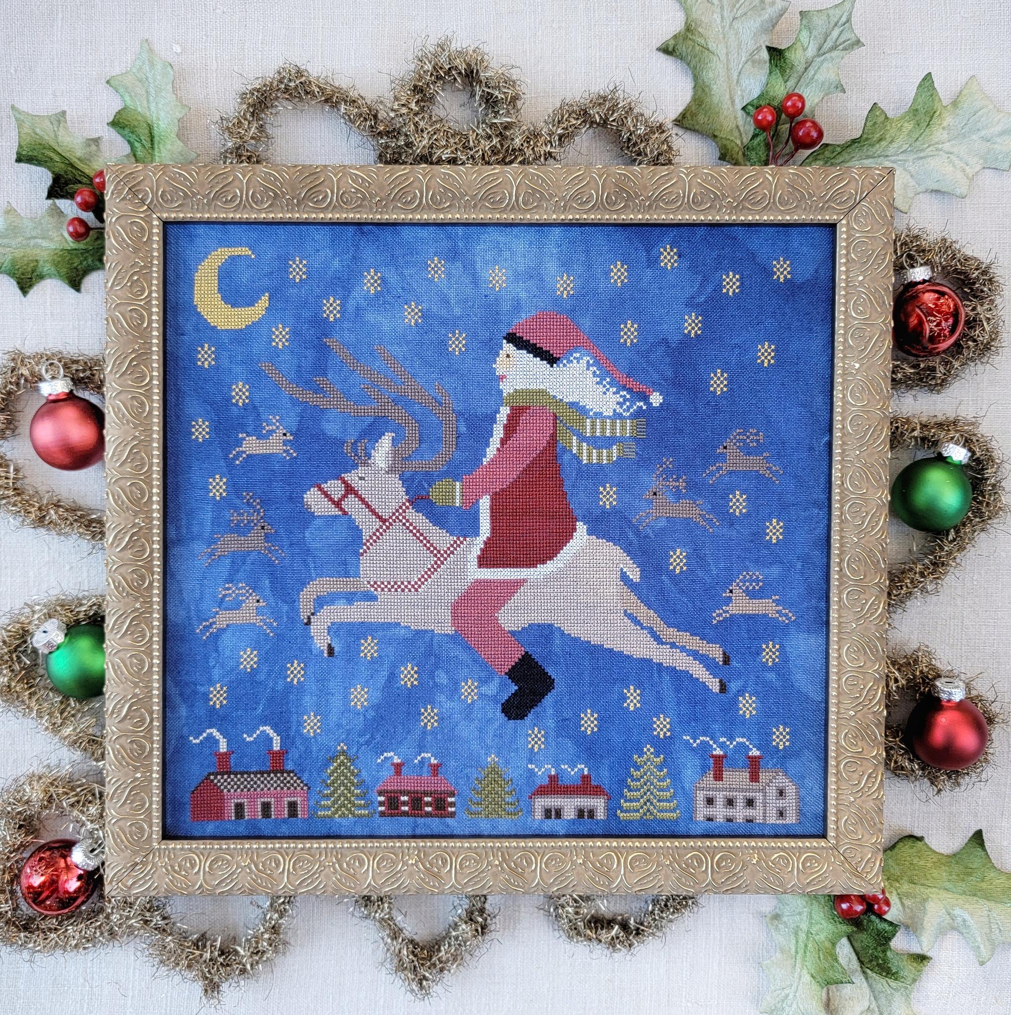 This cross stitch pattern from Kathy Barrick features Santa and his reindeer enjoying a bit of down time up in the starry sky! The example uses Needlepoint Silk floss.