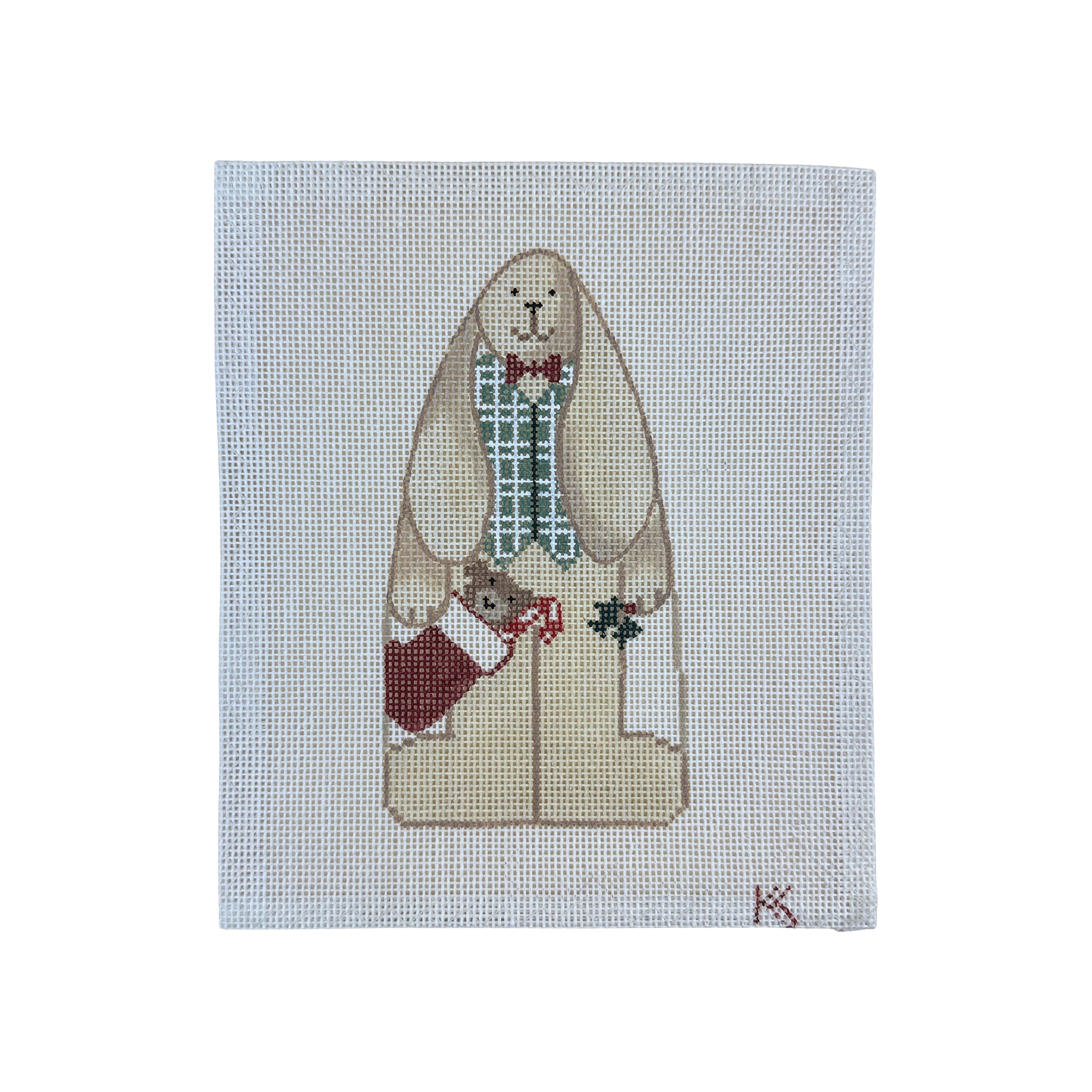 This hand painted needlepoint canvas by Kathy Schenkel features a bunny rabbit decked out for Christmas.