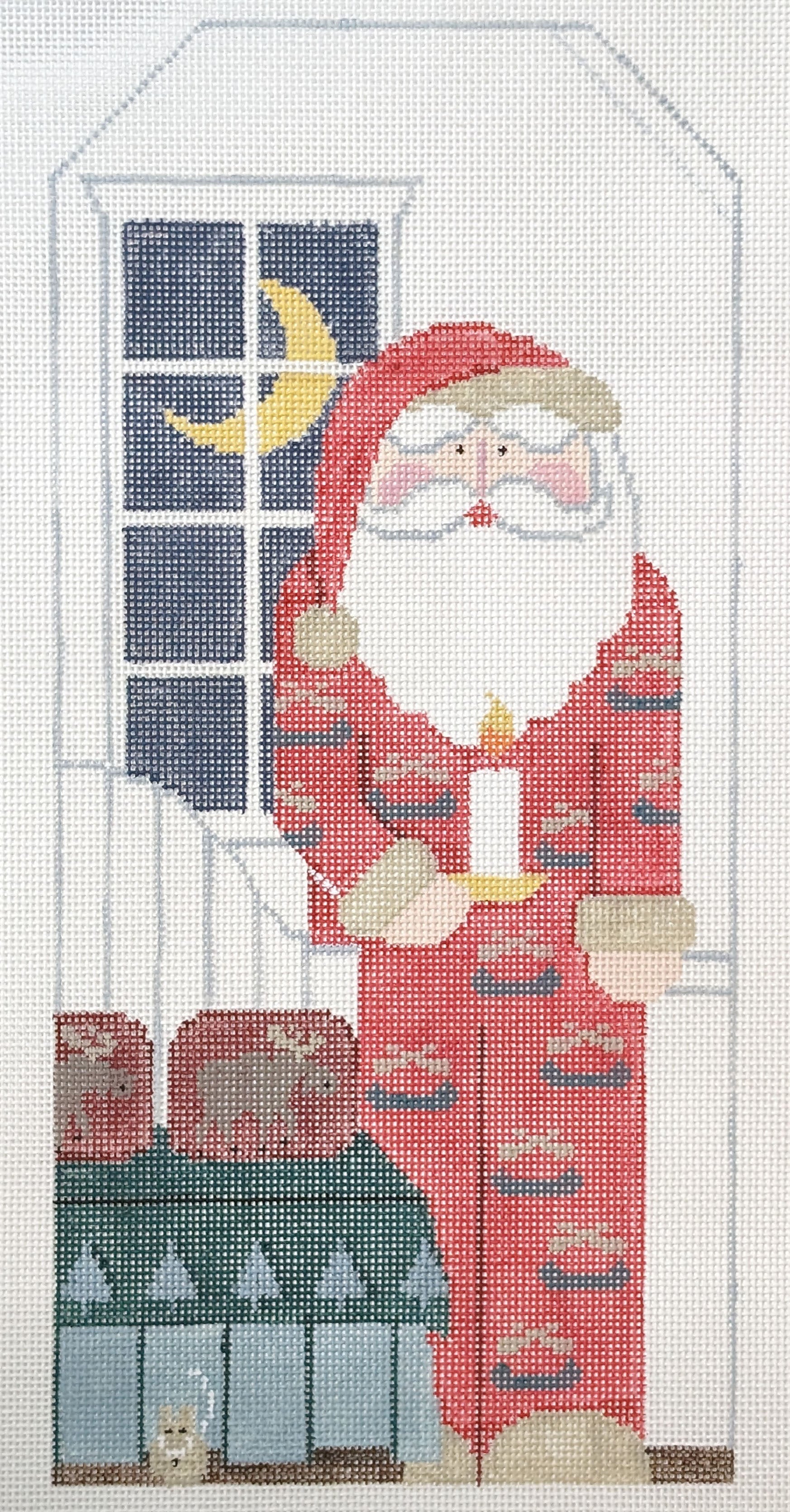 A beautiful hand painted needlepoint design from Kathy Schenkel Designs featuring Santa in pajamas. It comes with a stuffed teddy bear embellishment.