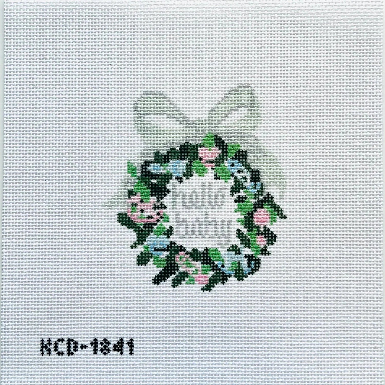 This hand painted stocking needlepoint canvas by KCN Designers features a lovely wreath with "Hello Baby".