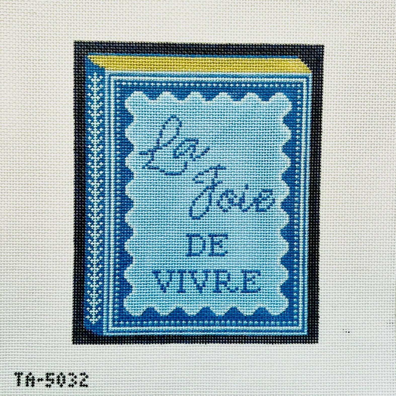 This is a hand painted needlepoint canvas from KCN Designers. It features a blue book with the phrase "La Joie De Vivre" on the cover.