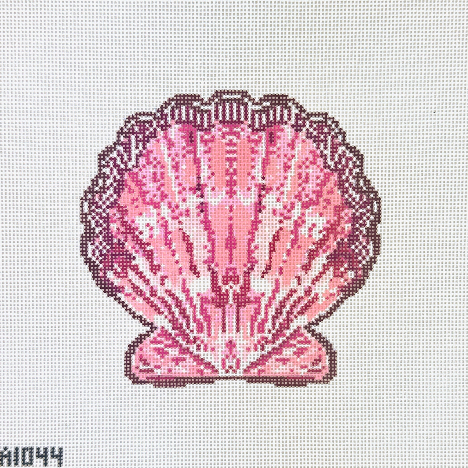 This is a hand painted needlepoint canvas by Thorn Alexander for KCN Designers. It features a pink scallop shell ornament.