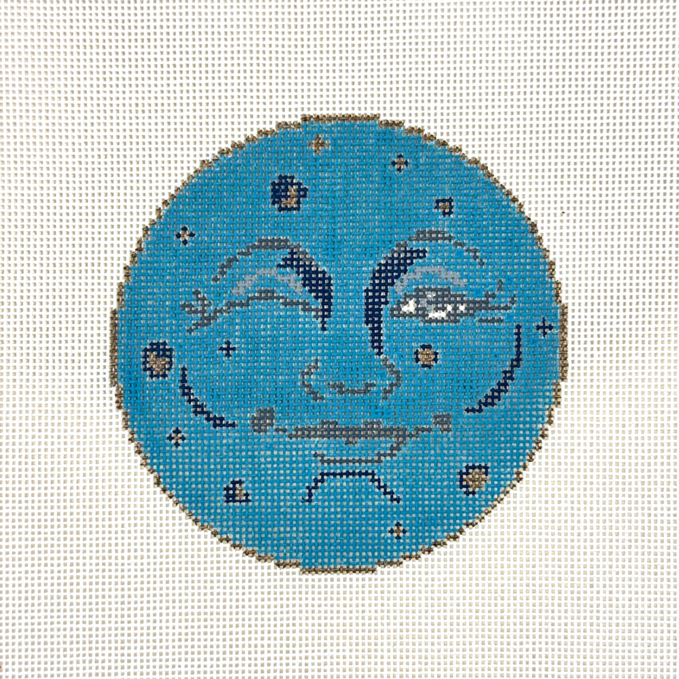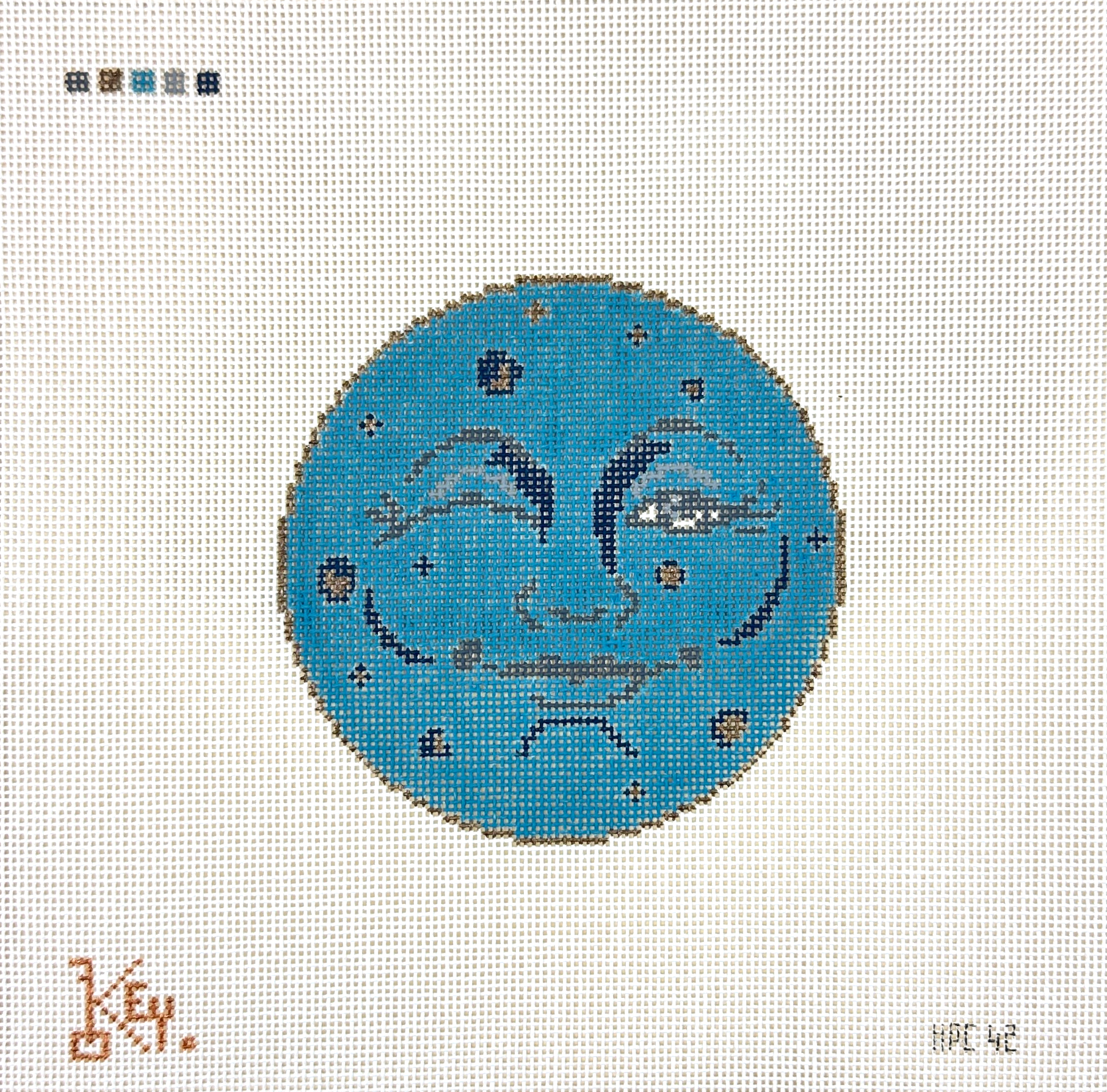This hand painted needlepoint canvas by Key Point Canvases features a vintage inspired winking moon.