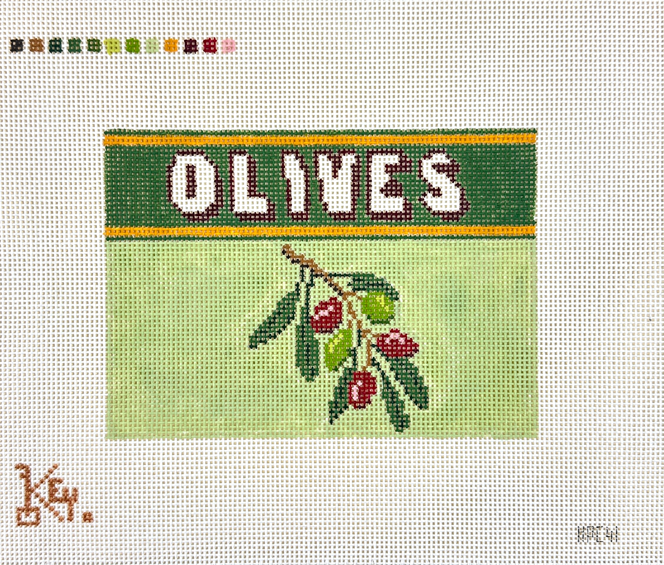 This hand painted needlepoint canvas by Key Point Canvases features a vintage label inspired design with a sprig of olives.