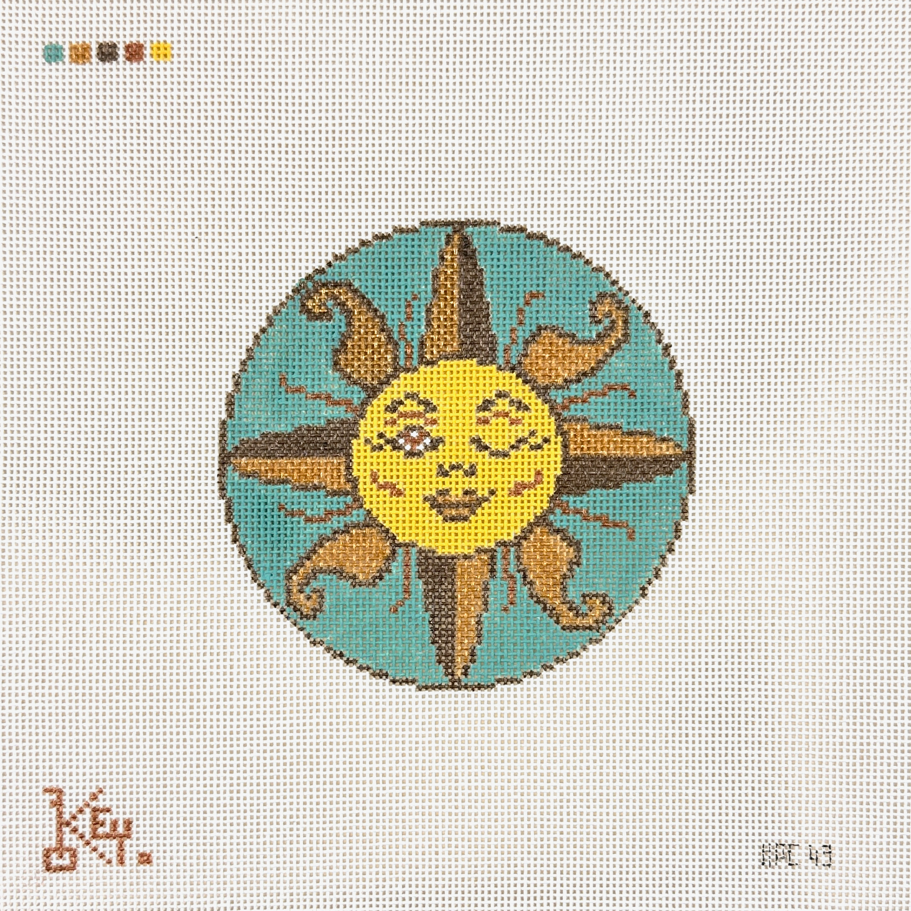 This hand painted needlepoint canvas by Key Point Canvases features a vintage inspired winking sun.
