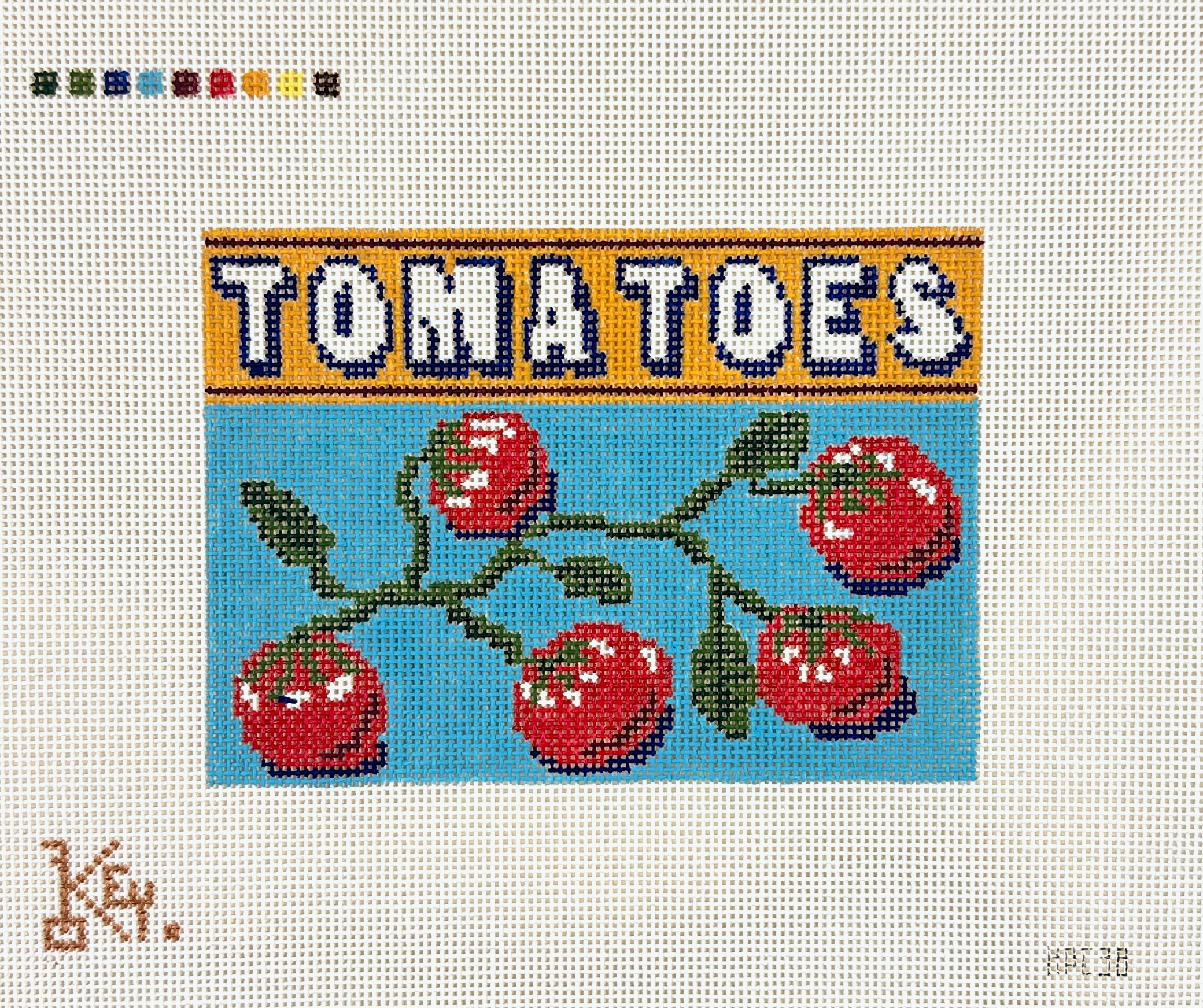 This hand painted needlepoint canvas by Key Point Canvases features a vintage label inspired design with juicy tomatoes.