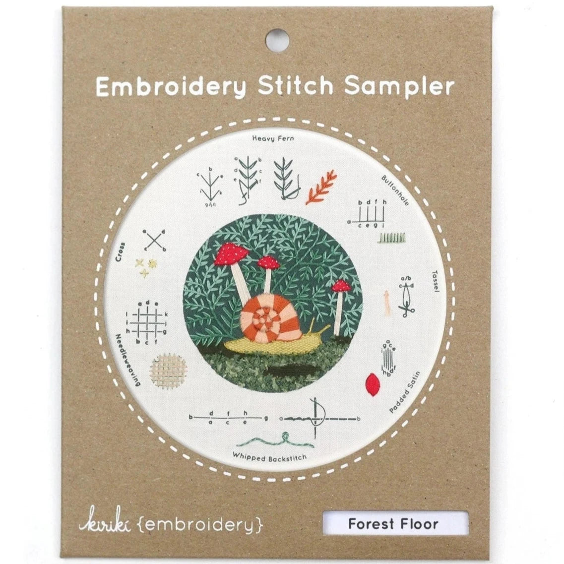 From Canadian brand, Kiriki Press, comes this whimsical Forest Floor stitch sampler. It's a great introduction to stitches used in Kiriki Press and other embroidery patterns. Each stitch is printed right onto the fabric with an easy-to-follow lettered guide, plus you get to practice the stitch several more times on the sampler, including a finished piece in the center.