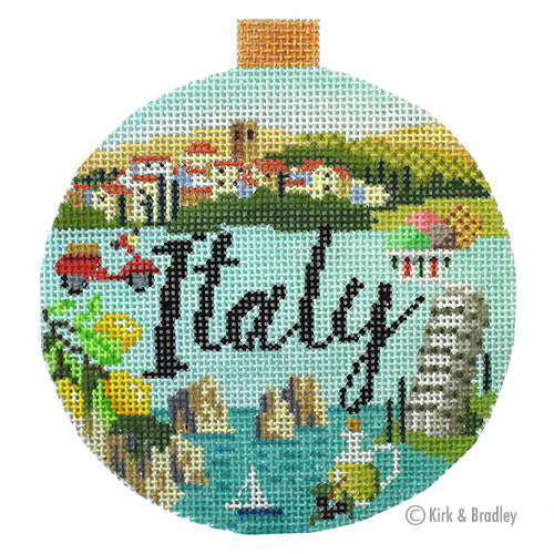 This hand painted needlepoint canvas by Bradley Needlepoint Company features a travel round highlighting attractions in Italy.