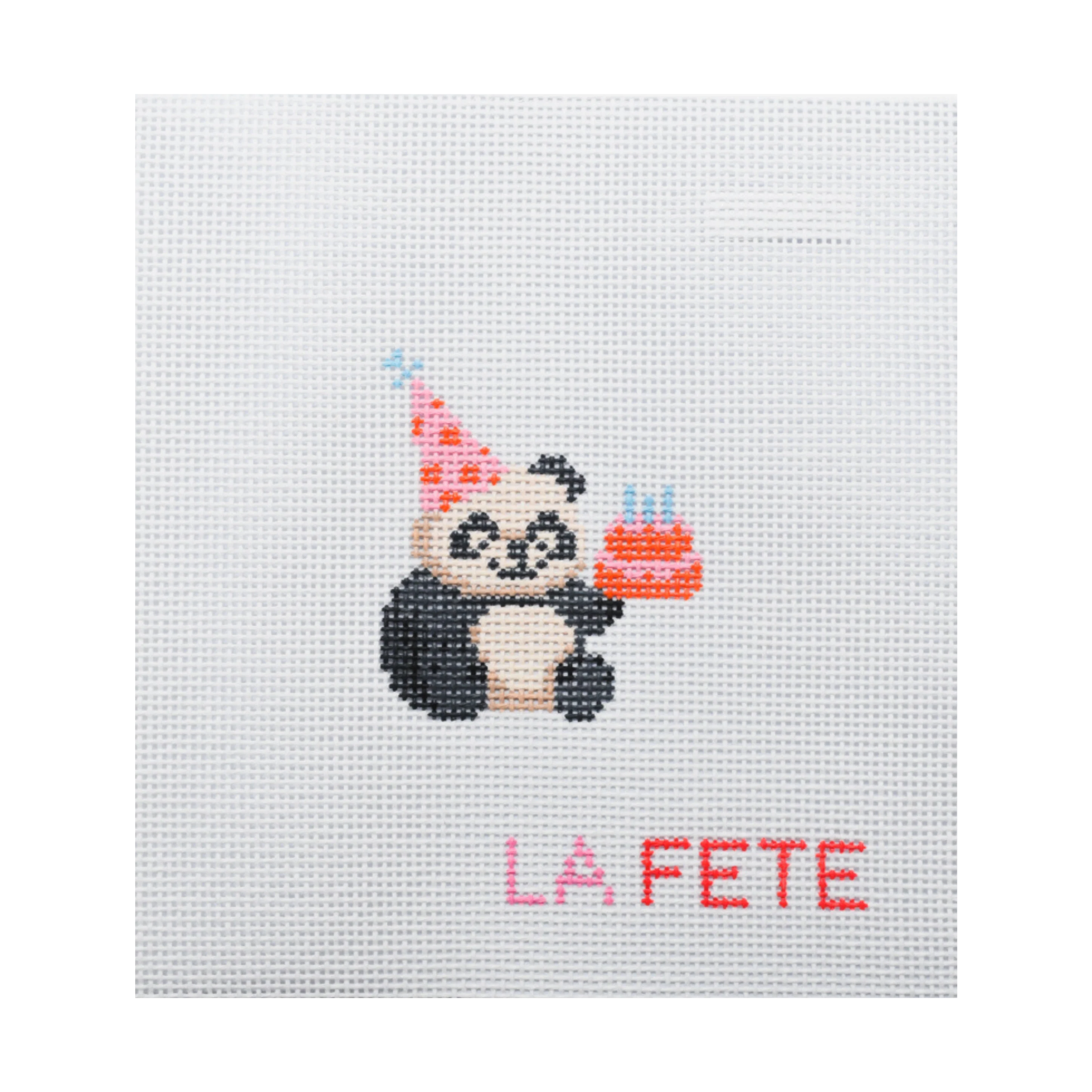 This is a hand painted needlepoint canvas from La Fete Needlepoint from their Party Animals series featuring a little panda wearing a party hat and holding a cake.