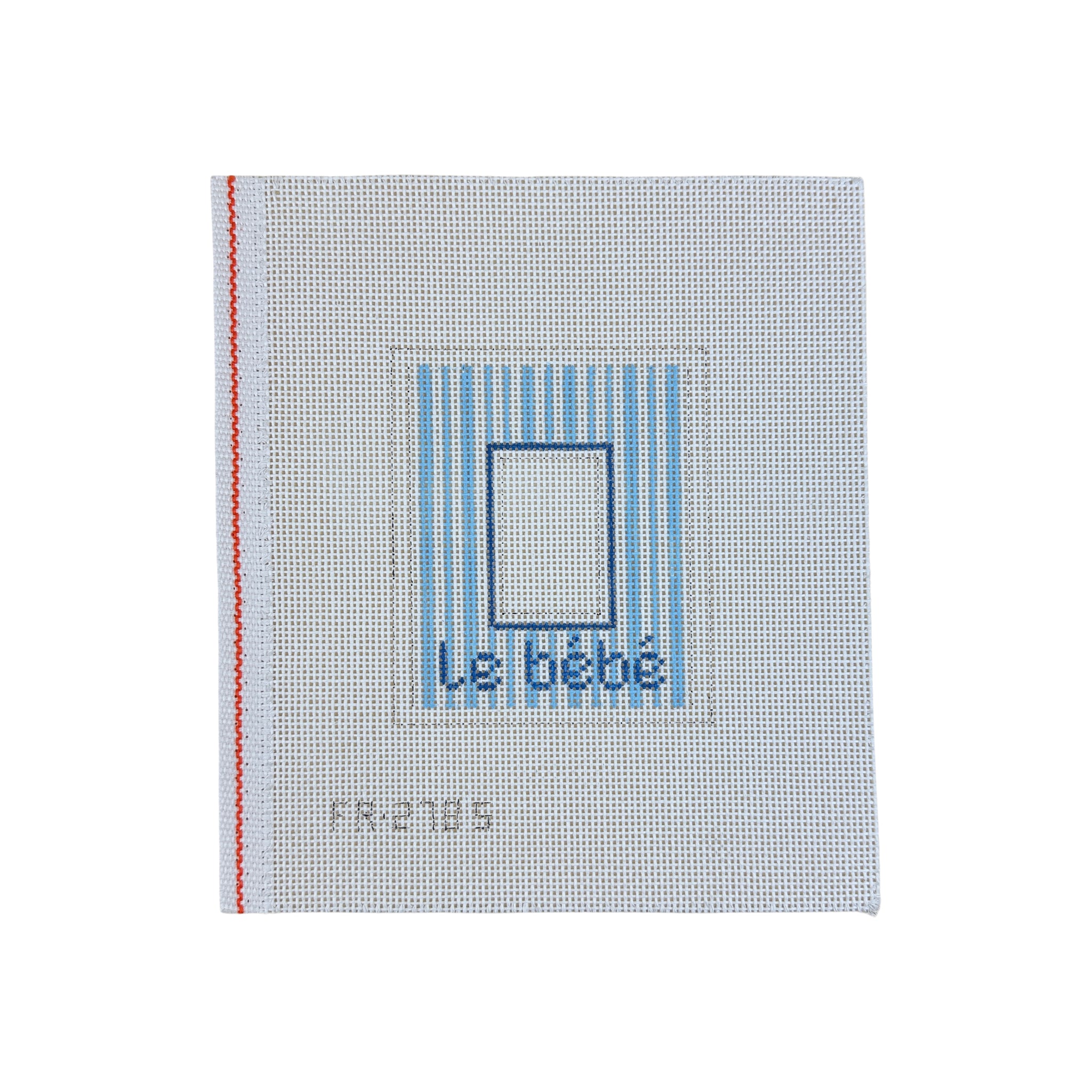 This hand painted needlepoint canvas features a blue stripe design with "Le Bebe" .