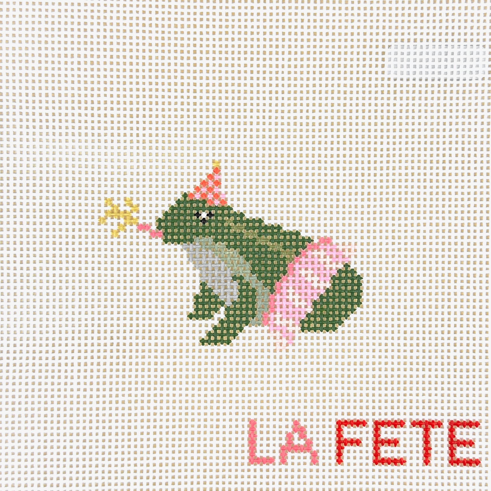 This is a hand painted needlepoint canvas from La Fete Needlepoint from their Party Animals series featuring frog wearing a pink tutu and party hat with a blowing a noise maker.