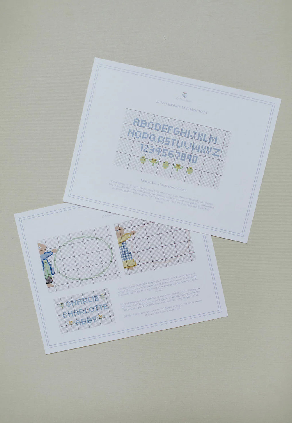 This is a hand painted needlepoint canvas by Le Point Studio. It features a sweet little bunny and an area that you can customize with a name or monogram (font chart included). This adorable style was designed to be finished as a tag for Easter baskets. Stitched examples shown for inspiration, materials and finishing services sold separately.