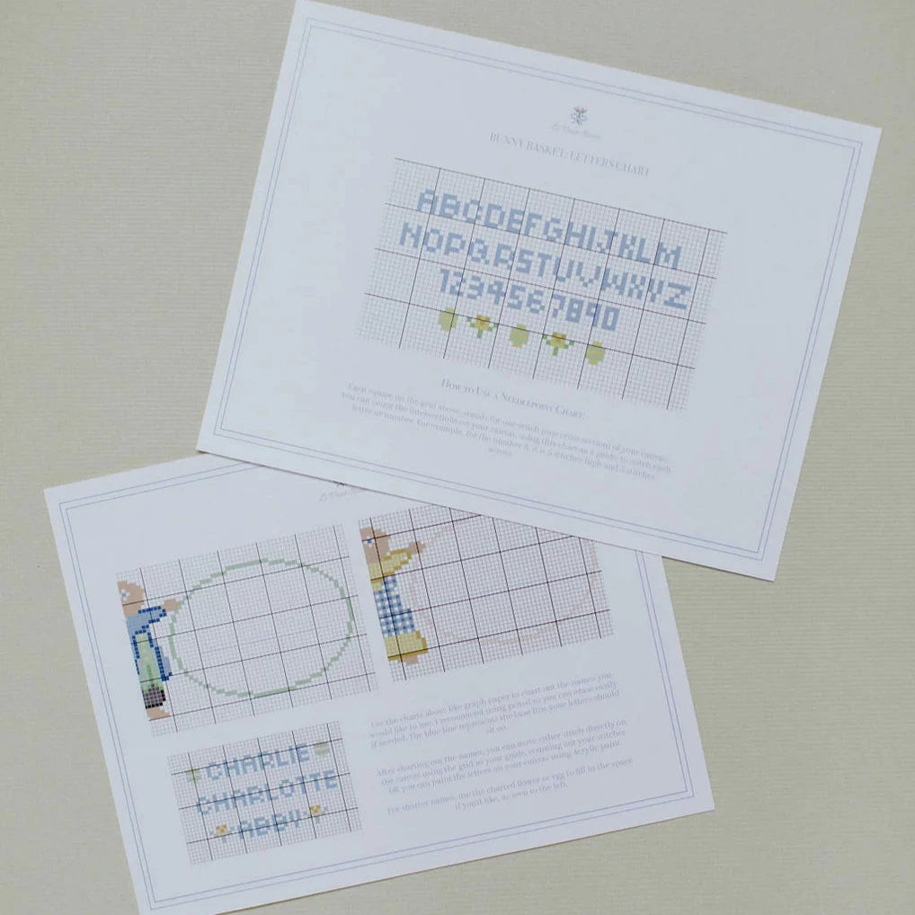 This is a hand painted needlepoint canvas by Le Point Studio. It features a sweet little bunny and an area that you can customize with a name or monogram (font chart included). This adorable style was designed to be finished as a tag for Easter baskets. Stitched examples shown for inspiration, materials and finishing services sold separately.