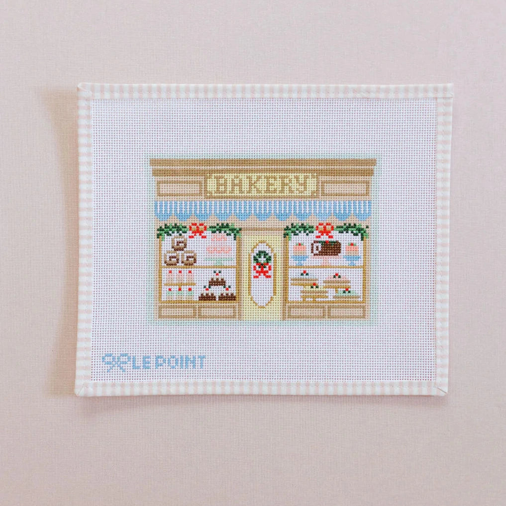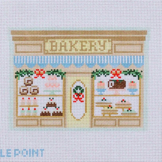 This hand painted needlepoint canvas from the Christmas Village collection by Le Point Studio features a bakery with windows full of sweet treats.